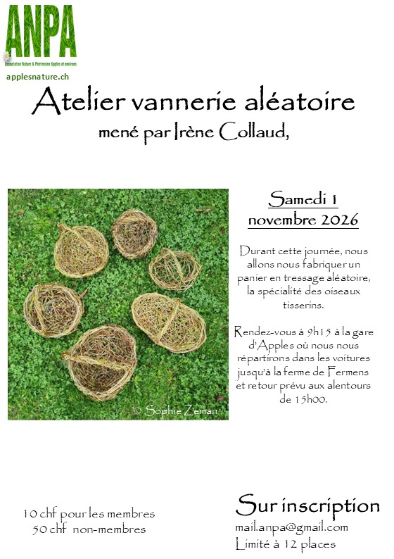 Bienvenue pour la premières sortie d’initiation à la vannerie proposée par l’ANPA et menée par Irène Collaud ! Lors de cette journée nous apprendrons à confectionner un panier que vous pourrez emporter chez vous. N’hésitez pas à vous inscrire, les places sont limitées !